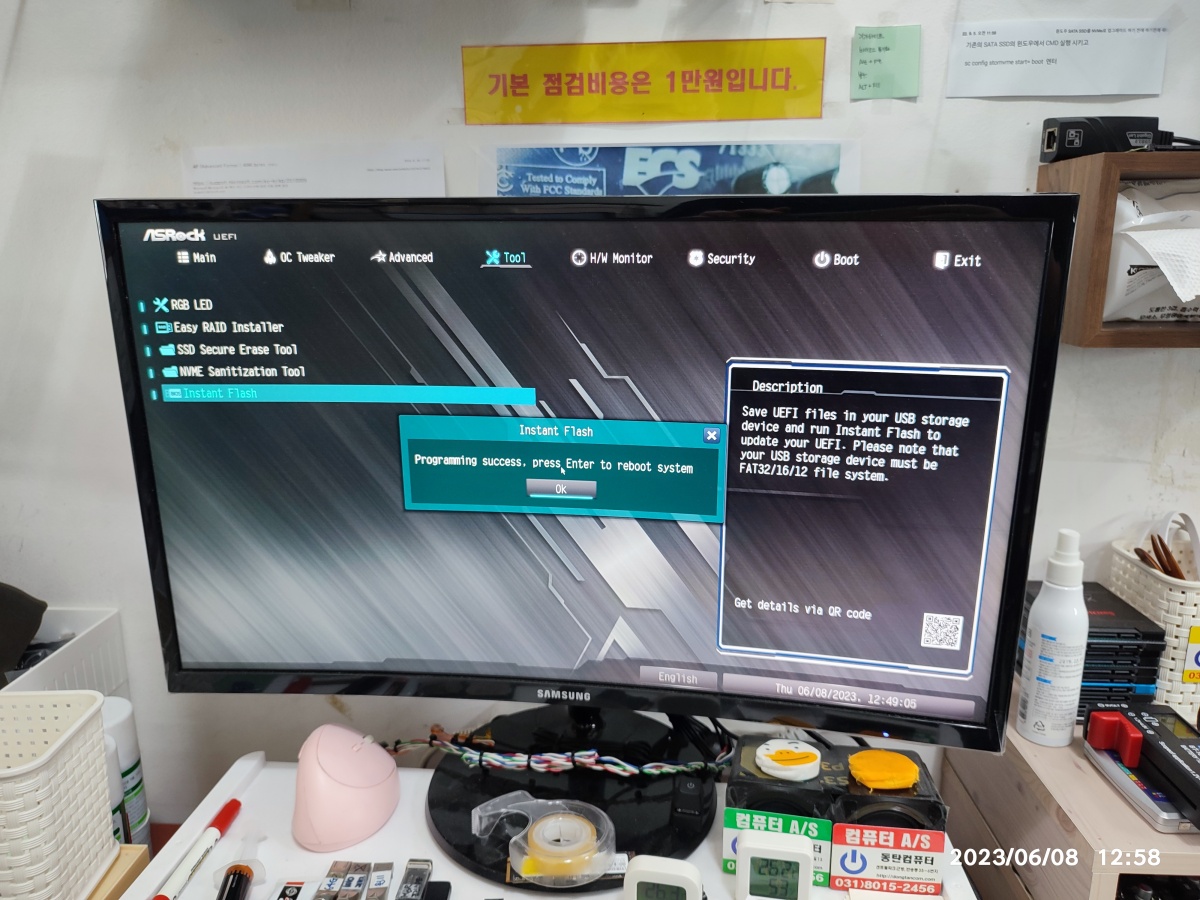 하드디스크의 테스트를 위해서, 제 테스트용 컴퓨터에 손님의 하드디스크를 장착해서 확인해보려고 했는데요. 아래와 같이 ASROCK 로고만 뜨고 다음 화면으로 진행이 안 됩니다.