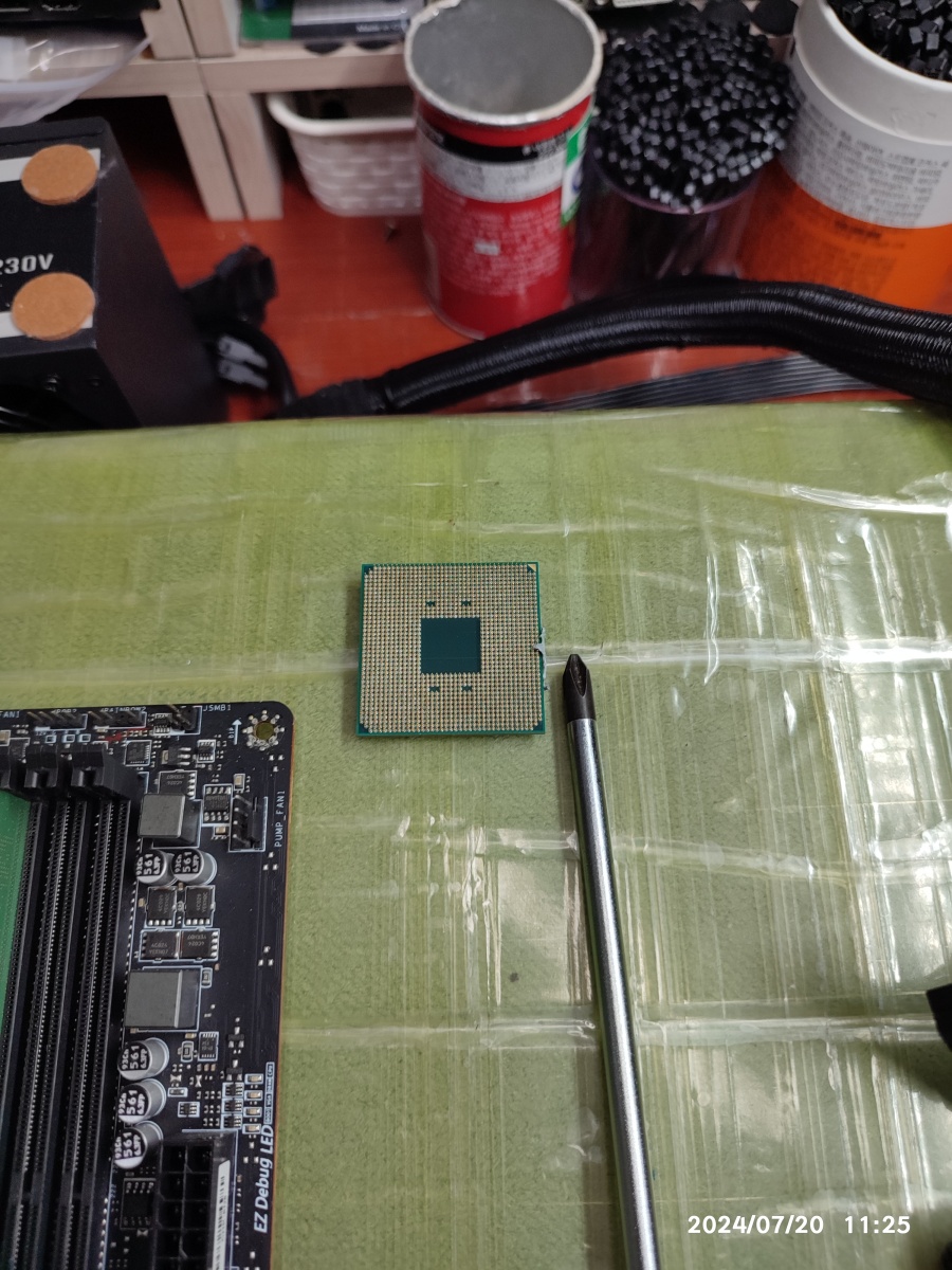 4) CPU 교차 테스트를 위해서, 손님의 CPU를 분리했습니다. 서멀이 많이 발려진 상태라서, CPU 옆면으로 서멀 컴파운드가 흘러넘친 상태입니다. 손님의 CPU는 라이젠5 5600X입니다.