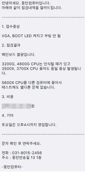 이렇게 포스터 한 페이지로 요약해서 읽어볼 때는 결과를 알 수 있으니, 별일 아닌 것처럼 간단해 보이지만, 상당히 시간이 많이 걸리는 점검 과정입니다.이 과정을 손님이랑 같이 하는 건 어렵습니다. 11시 즈음에 방문하신 손님인데, 점심시간 12시까지 대략 50분 정도 같이 점검을 진행했습니다만 위와 같이 점검 시간이 길어졌기 때문에, 맡겨 놓고 다녀오셨습니다. 점검이 완료돼서 원인을 찾으면, 문자로 요약해서 알려드립니다. 문자 받으시고 찾아가시면 됩니다.
