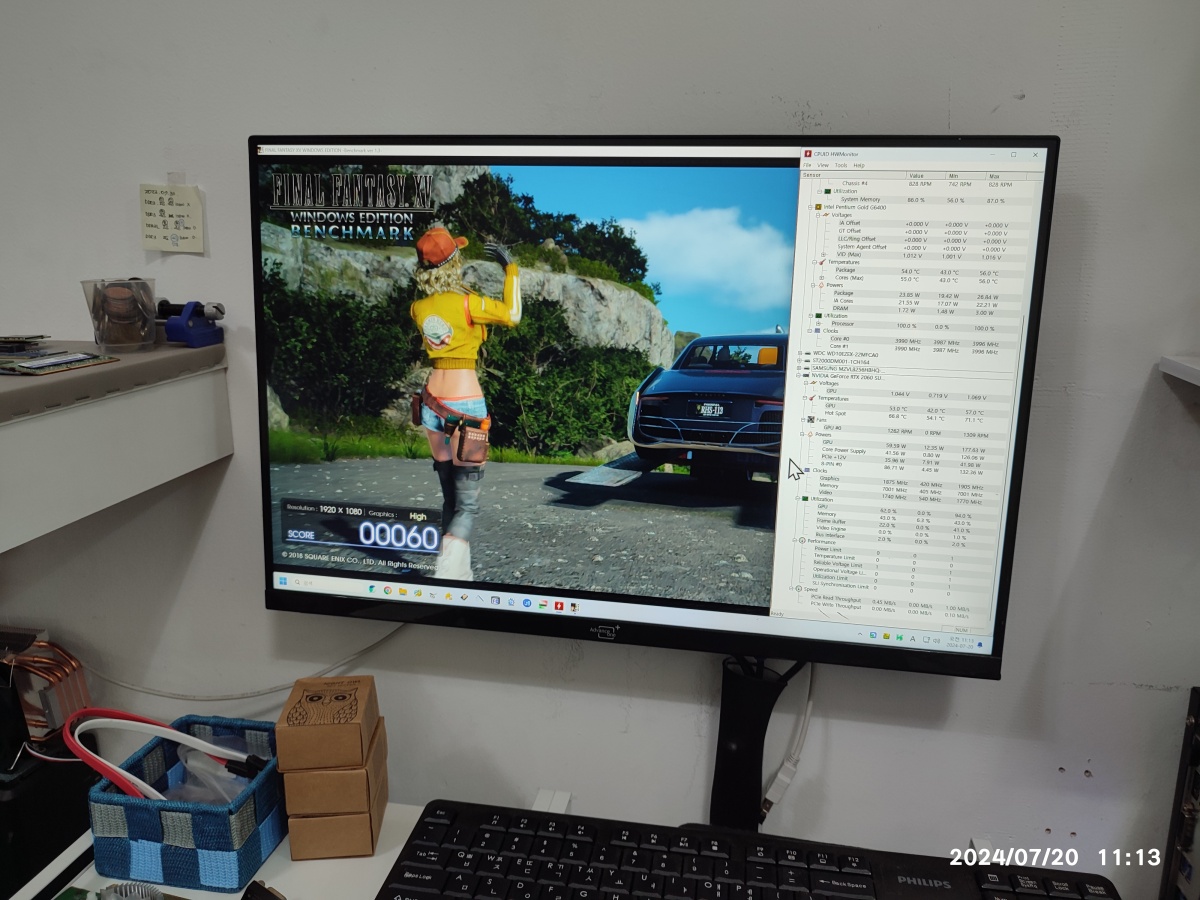 아래는 두번째 컴퓨터에 손님의 그래픽카드를 연결해서, 윈도우 부팅까지 진행하고 게임 벤치마크 프로그램을 돌려봤습니다. 일단은 화면이 안 뜨는 증상이기 때문에, 화면을 띄우는 것과 벤치마크 프로그램이 실행되는 것까지 확인했습니다.